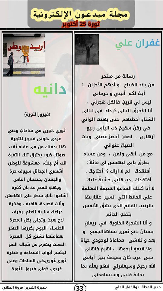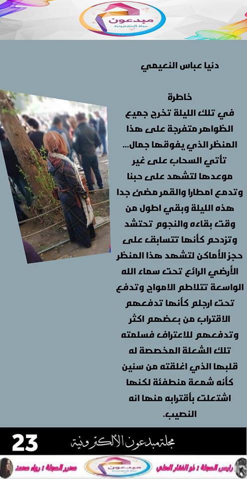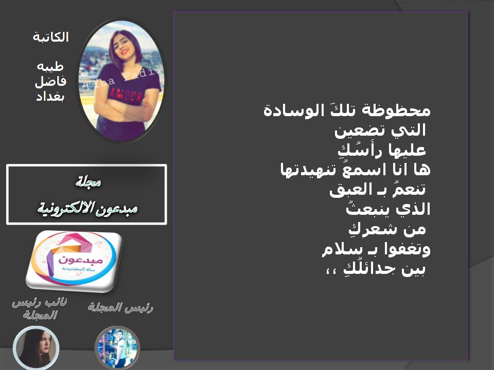 Irakurri gehiagoفاطمة عزيز سعيد الاسمي الفني فاطمة العامري من مواليد 1998 خريجة قسم ترجمة واجيد التلكم باللغة الانكليزية والفارسية والالمانية كانت بداياتي من عمر ال 17 كان لدي شغف بقراءة الروايات وكذلك الشعر استمع لكبار الشعراء واقتبس منهم الابيات التي تلامس قلبي وبعدها بفترة قصيرة بدأت اكتب ابيات ونصوص قصيرة تخصني وطورت من موهبتي برغم لا يوجد لدي تشجيع من عائلتي ونشرت شي بسيط عني ولاقيت ردود محفزة من شعراء واسط وبعضهم منحني نصائح ودعمني بكلمات جعلتي استمر في كتابة النصوص والقصائد اول بيت كتبتة... بليلي خضر جم جرح واسكيتهم بدموعي جيبولي دكتور العشگ بلكت فهم موضوعي وكتبت ايضاً مليت الملم بالقلب, ندبة وتحط بروحي تنحسب راحة اعلة الگبر, لو مرة هادي بنوحي جم دمع ضل ابلا حجي, وبات بسواد اعيوني صايغهن بصوغ الذهب ,واتشابگن بمتوني .. . مد وجزر حضي صفة لاانة وي روجي استمر, ولاانة وية همومي وجم مرة كاسرني العمر, واتعكز اعلة اوجاعي حالف اذا يوم اضحكت, يرجع يحط بكاعي واعلية يرهم كل حزن, حطت الناي لراعي مكاسر الهاون مستلذ, والهيل هوة الناعي واصبر وكالو كل ,صبر بعدة احلول وابين كل ناسي اوكفت, بس انة احسن مشلول ومسرح عمر هية الحياة وتخلص وكلمن بدورة وكلمن بحزنة اختص وكلما يمر ميل الوكت,اسنيني صارت تنگص وكاس الشماتة اتزايد , بقلبي وغص ياعمر لوح للفرح, خلي يمرلي بلحظة مااخذ اعليه الوكت, ادريه حلمي اتشظة وبعيني حلم ومو مهم, يبقة اسمة حلم اليقظة واتمنى انة اعلة المتن, بجنازة اداري ابروحي وطيور هالناس اصبحت, ياهو اليهم لجروحي وشلت من عندي الصبر, بية الصبح يعقوبي وياهم اتجر ساعتي واعلية بس مگلوبي چادر فواتح ياقلب , جمعت كل ذنوبي لية اثنعش باب انفتح ليش واحس مو ثوبي وكتبت ايضاً قصيدة اسميتها ملامح عشك .. انة بطباعك احس كلش احير اكتاب انتة وواجب اقرة المحتوى والله احيرن وجهي يم ياصوب ادير خدك ,عيونك شمس تنكط ضوة نخلة صيتك ماالوحة شما عليت شمحلة نومي بوسط تمراتك نوة شمع ماعايش گبل ليش ورجيج وقلبي يم صوتك احس كلش خوة احنة مرضة ومانفع بينة الطبيب... وبينة علة وجن ترانيمك دوة روحي وسلالك تلملمها اعلى كيف وانة استنگي هواك من الهوة عنب بعيوني ترف وبيدك يذوب اذن تحصيلك عبر كل مستوى انجح بدرس العشگ وارجع واعيد وحتى نكعد بلقسم عين وضوة احنة عطشة وياغيابك جن هلاك بنظرة من عينك اظن ضامي روة وياما خطواتك احس بيها سكون وكل الم بأرض الملامح جن طوة وحاسب احسابي اذا مت اعلى ايديك ثوب اصورنة لمن جنة سوة