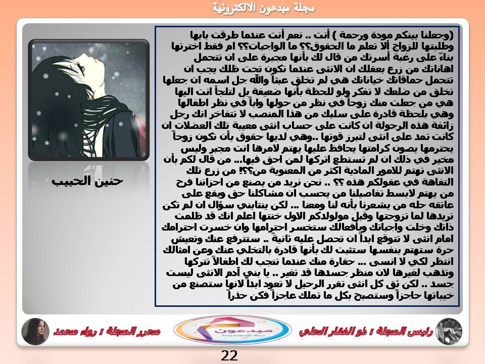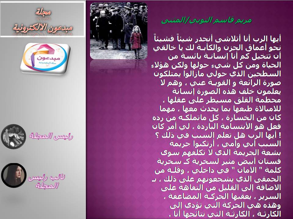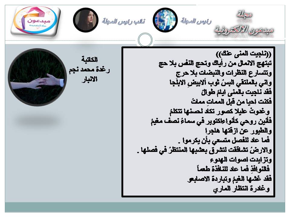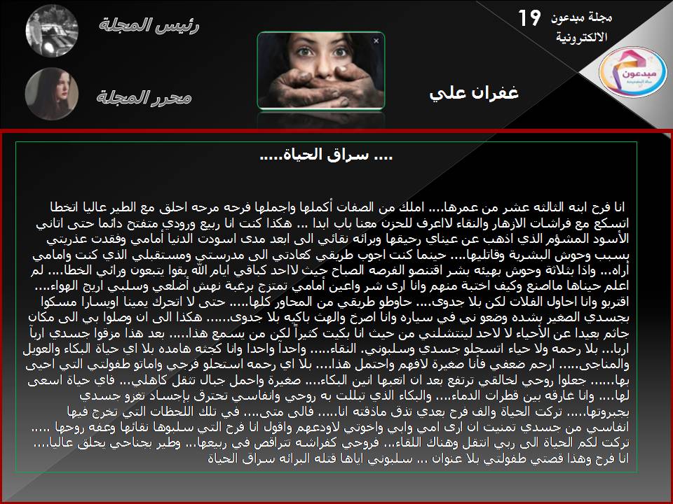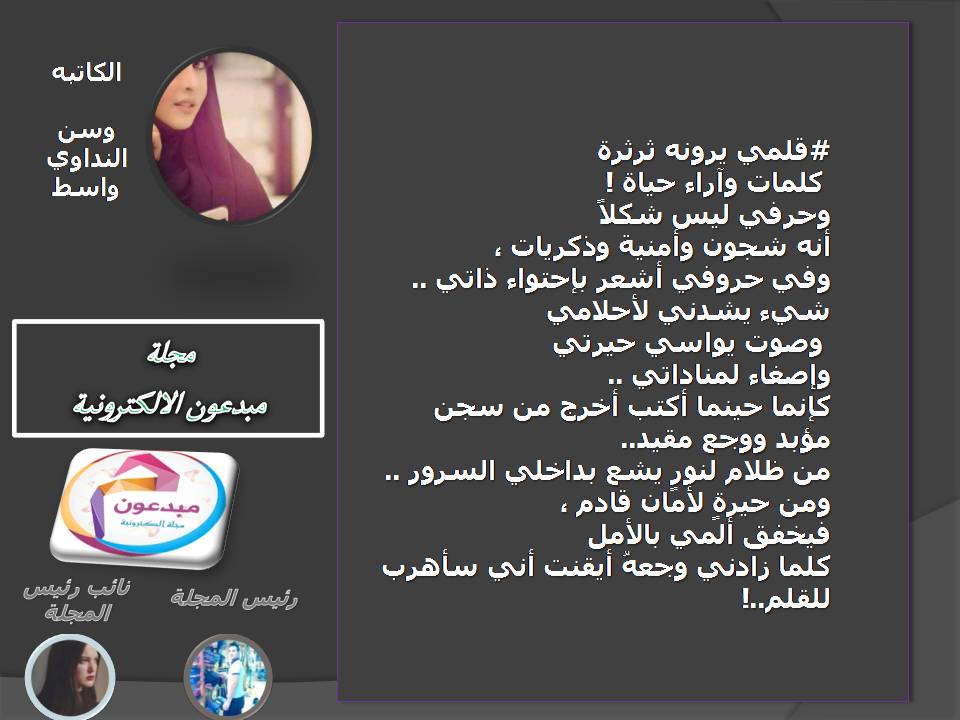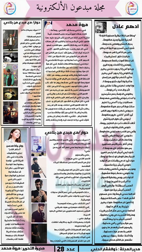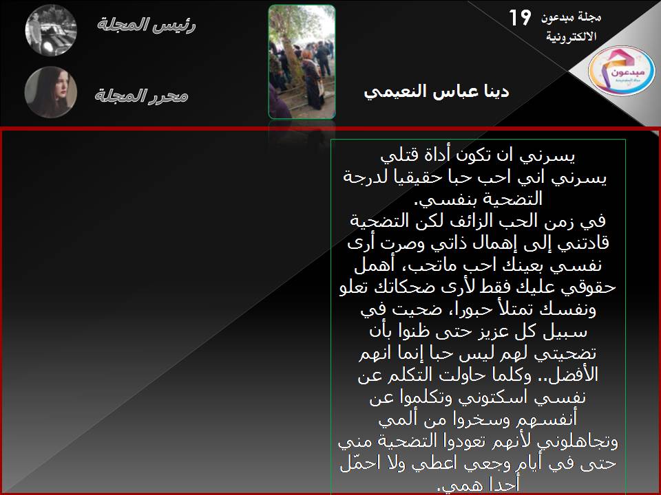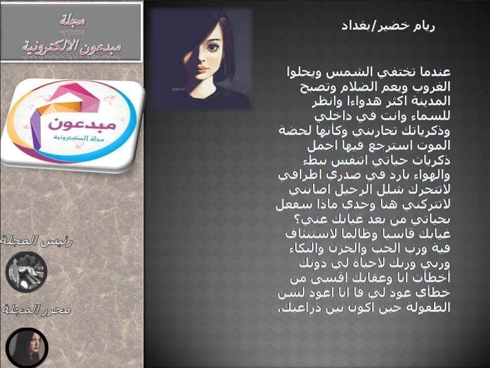 Irakurri gehiagoحوار مع كاتبة من بلادي الكاتبة : لبنى عباس كان في الحوار الكاتب والشاعر : ذوالفقار الحلي الأسئلة العامة س١. من هي لبنى تعريف غير مسبق لها؟ ١. لبنى عباس، بغداديةٌ وأنتمي لكل بقاع القلب الرافدَيني، وأنا فتاة تغوص بعمق هذه الحياة بحثاً عما لم يعرفه الانسان بعد. .. س٢. الى من تميل لبنى في كتابة النص وبمن تأثرت والى اي مدرسة تنتمي؟ ٢.أميل في كتاباتي للنصوص النثرية؛ لأنها غير مكلفة وقريبة من أذهان المتلقي. لم يكن هناك كاتب معين أو شاعر مؤثر، أما انتمائي للمدرسة الواقعية الأدبية؛ كونها تصوّر الحياة واقعياً دون الإغراق في المثاليات. .. س٣. يقال ان لبنى لاتستطيع كتابة النص الزجل ( وليد اللحظه)؟ ٣. .كانت لي بعض المحاولات مع أستاذتي "سُهى مولود" صاحبة مشروع "حرف فـ كلمة فـ كتاب" والحمد لله نال إعجابها، لكنني لا أرغبه ولا أمارسه كثيراً. .. س٤. هل نصوصها مستوحات من حياتها الخاصة؟ ٤. لم تكن مستوحاة من حياتي الخاصة بقدر ما تترجم الواقع الذي نمر به. .. س٥. هل تميل الى كتابة النص الادبي المقفى؟ ٥. لا أميل إلى المقفى. أميل في أغلب كتاباتي إلى النص الأدبي الحر؛ لأنه خالٍ من التزويق والإضافات. .. س٦. اشياء في داخلها لاتستطيع البوح بها في الكلام هل تستطيع ان تعبر عن مشاعرها في النص؟ ٦. نعم غالباً ما أترجم مشاعري من خلال نصوصي. .. س٧. هل شاركت لبنى خارج العراق بنصوصها ام فقط داخل العراق؟ ٧. كانت لي مشاركة في كتاب ورقي "أقلام أدبية بـ أنامل عربية" للكاتبة "حياة" طبع في الجزائر. .. س٨. هل لانغام القيصر سبب في كتابتها للنص؟ ٨. نعم دائماً أفضل كتاباتي في ليلة ممطرة يصاحبها آنغام القيصر لما يحمله صوته من إحساس وَرٌقِي وقد يدعمني كثيراً في مفرداته العميقة. .. س٩. يقال لبنى تميل الى الهدوء، ما سبب ذلك؟ ٩. في أحاناً كثيرة أميل إلى الهدوء' لكنني أتقن لغة الضجيج أكثر. ......... ننتقل مع الكاتبة لبنى عباس الى الاسئلة الخاصة س١. ماذا يعني لك .. عباس التميمي؟ ١. عندما أحتاج لوطنٍ يحميني وصدر يأويني وقوة تسندني أنادي "أبي"، فهو ضوء حياتي الذي لم يخلق بعده شيء. .. س٢. القيصر كاظم الساهر؟ ٢. سفير الأغنية العربية. يعني لي الفخامة والبساطة في آنٍ واحد. .. س٣. لونك المفضل؟ ٣. الأزرق؛ لأنه لون السماء والبحر ويرمز إلى السلام والهدوء والطمأنينة كما السَكينَة. .. س٤. عطرك المفضل؟ ٤. دائماً أفضل الأشياء الطبيعية، ولذا فـ "عطر الورد" هو المفضل لدي. .. س٥. في كاتبة النص الى من تميلي الرصاص ام الحبر؟ ٥. أفضل الرصاص. .. س٦. اجمل نص طبع في ذاكرتك لكاتب ، مع ذكر الاسم؟ ٦. "الإنسان الذي لا تتغير نظرته لك رغم كل أخطائك المتتالية هو يحبك حباً عظيماً، وغالباً هذا الإنسان هو أمك". مقتبس من كتاب "الأمنيات لا تموت" للكاتب "عبد الله حمد". .. س٧. ماذا تعني لك بغداد؟ ٧. ألهة العشق. بالنسبة لي ك أول قبلة بين حبيبين.. كعصفور يغرد قرب نافذتي مع بزوغ الشمس. .. س٨. اقرب نص لكِ من كتاباتك؟ ٨. "كل ما أريد فعله هو أن اثبت لذاتي أنكِ تستحقين ذلك". .. س٩. لغة العين ماذا تعني لك؟ ٩. تعتبر العيون نافذة الروح، ويمكن من خلالها التعمق في تفاصيل الشخص ذاته؛ فقد تعكس العيون الكثير من المشاعر الدافئة. نختم فقرة حوار مع كاتبة من بلادي بنص للكاتبة لبنى عباس
