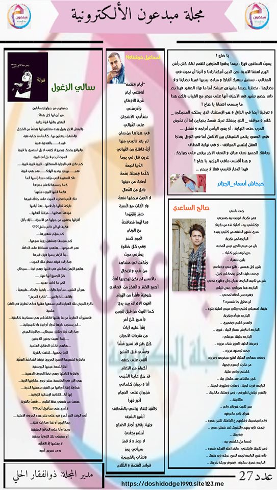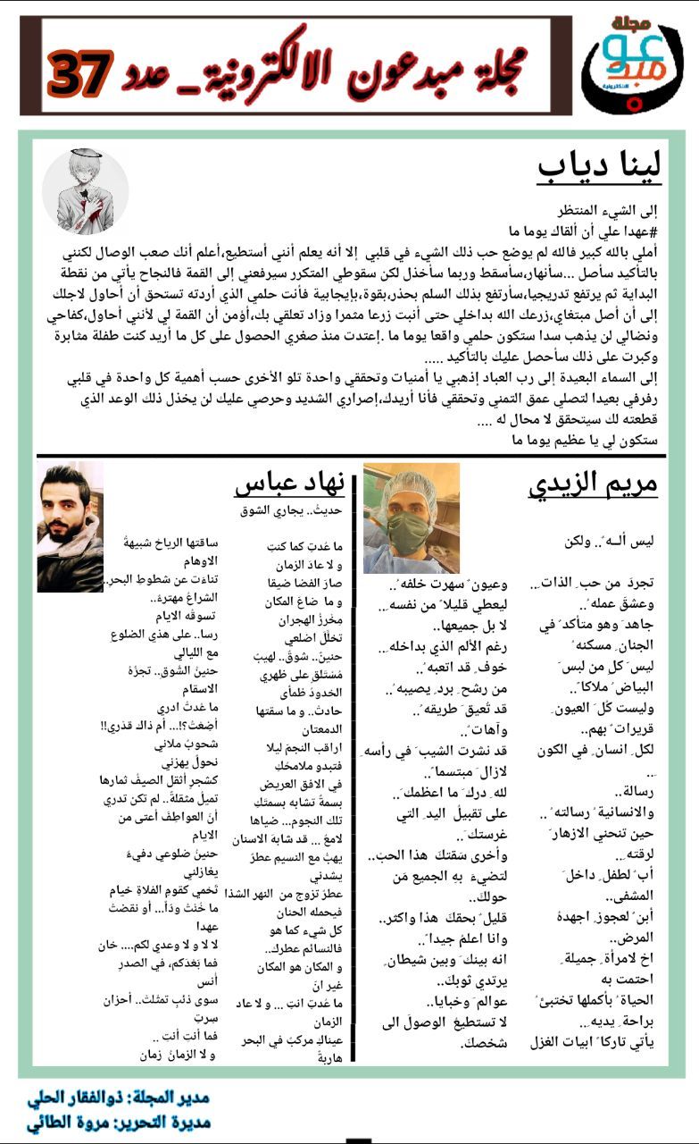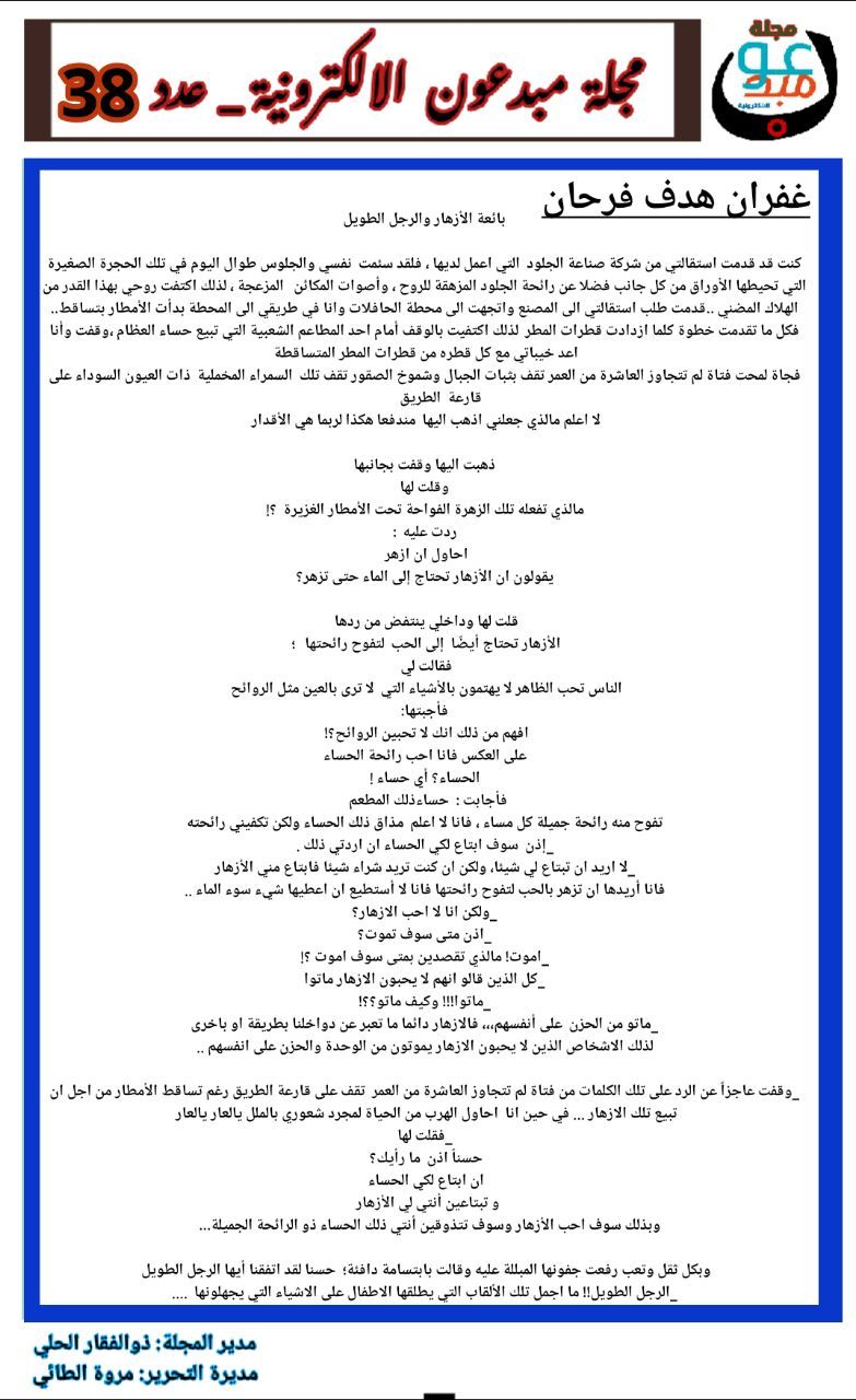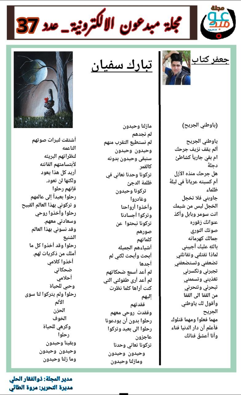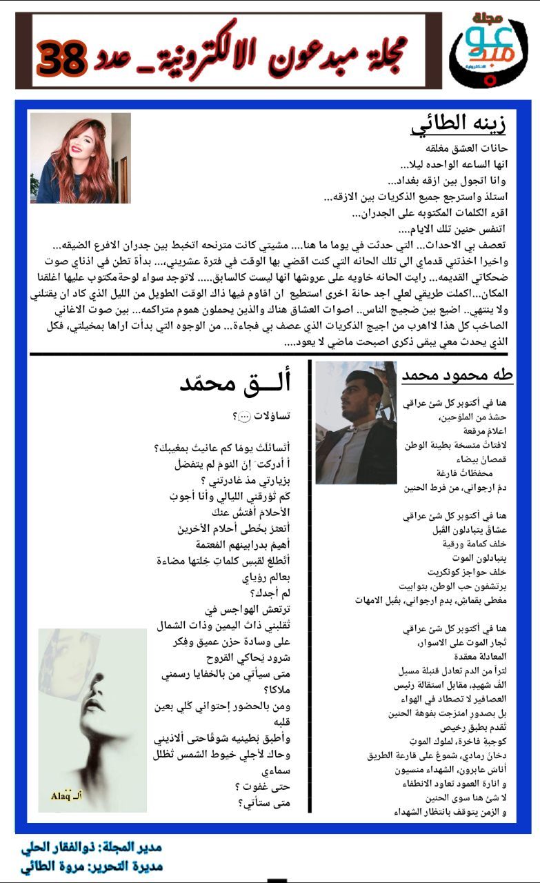 Irakurri gehiagoقصة حياة مبدع انا وانتم مع المبدع الشاعر علي الحجيمي ولد الشاعر علي عبد الكاظم حسن الحجيمي في محافظة النجف الاشرف في عام 1990 وترعرع بها واختير له اسمه الفني نسبا الى عشيرتة بني حجيم العريقة وفي مرحلة المتوسطة وخصوصا في متوسطة المتنبي بدأت موهبة الشاعر بالظهور وكتابة النص الشعبي العراقي _ويقول ان من مد لي يد العون الاستاذ حسين الخالدي وكانت اول قصيدة كتبت له في عام 2009 وطرحت الى الوسط الادبي في عام 2011. طرحنا علية عدة تساؤلات ومنها كانت مني هي ملهمتك في كتابة النص الادبي او الشعبي وكان جوابة _ وحدة موضوع القصيدة اذا كانت حسينية ف للحسين وللسيدة زينب ع واخريات للوطن والصديق والحبيبة. وانتقلنا الى فقرة ماذا يعني لك _ منتدى خواطر عائلتي الثانية _ الشاعر احمد الصالحي اخي _ اللون الأسود الخيانه _ محافظة الكوت الجمال _ الساعة السابعة صباحاً الام _ القانون الوقت _متوسطة المتنبي البذرة الاولى للشعر _ العيون النرجسية القصائد الجريئة. وننتقل الى اجمل ما كتب الشاعر علي الحجيمي من نصوص شعبية قصيدة ها شلونك هاشلونك تذكر اسمي لو نسيته انه ذاك الرادك تصير بهويته بعدك من عيوني تعرفني شريد بعدك اتنزل دمعتك لو تحس بيه بعد جنت لونك ينخبط وي لوني اريد ولك ماردتك قصيدة لو ردت اكتب جديد ليش هجي ورحت فجأه وعذبتني شبيك ماحسيت بيه وعودتني والله لو متغير افضل جااكولن حسستني ليش بأول ضحكه من غيري عفتني اااخ لو كلبي مثل ذاكرة الأعمه مايجي انسان بصفنته حتئ مااكلك شلونك لأن لونك ماحفظته حيل مكسور واكابر عافك يكلولي اكلهم لا يحبني وانه عفته انه ذاك الجذب يضحك وبطرف عينه دمعته انه ذاك البالصور جذبه ضحكته انه ذاك العالفراشه يموت سكته انه ذاك الجان واعي هسه يمشي بلاوعي انه ذاك الغيرت كلشي بحياته حتى من يضحك نعي خلوني مامهتم واغني المايوجعنكم يوجعني تدرون شنهو الراح مني راح الجنت وي روحي اوصفة الحبيته صدفة وراح صدفة احساسي من يلجمني اعرفة معناها گلبي يريد ولفة ونص اخر بعنوان عركة ليل بعدني بحيلي مامحتاج لچفوفك وانه وي الليل عركه ولمن اشعل نار تجي وتطفيها من خوفك واعرفك من تهد ماتگص رگبة طير تهد بكرابها سيوفك من اشوفنك بعيد ورحت عن العين عيني زغير تشوفك الگبل مايگدر يعوفك ابشرك هسه كام بصفة لومريت هم يكول ماشوفك عشرتك ظلمة تشبه طارف زلوفك وكل هذا واجيت محضر اعتابك بعد ماصار گلبك مثل طبت السوگ اليزورك مايدگ بابك اجيت بلا نفع بصمة على چف محروك المن جاي وشجابك جرحك بعده ماطيب لهسه انزف من اصوابك دور غيري يحلالك انه البعد مايحتاج لامثالك انه الحالة صاير زين چي ميفكر بحالك انه الگلبه ميت لازم تشيعه وثوبلي الصور والشيب والدمعه حب وانتهه وراح ومابعد رجعه هوه المنلجم ياااخ التشبعه الضل ياكل ابروحه الخاطر يشبعون اجو كلوله انت انسان لو شمعه انه الغمضت عيني وموبحال النوم حجي بعيوني خاف الوادم تسمعه تره النزلن دموعه كبال اليهابوه لو يضحك عمر ماتنشف الدمعه ان الشايل كرامه الروحي ماطخ راس من طخيته الك ضنيتك ترفعه اطمن بسمي خاطر بسمك يصيحون واكول الحب حرب ينهاب بالفزعه اذا ينطم وتد معناها خيمه تصير وانه جاي ابني بيت احلامنا بوجعه .. وآخر يقول به الشجرة المثمرة مابي فايدة يغثك المااحس بيك مثل المافهم موضوع ومركز لأن عشت الوفه يم وادم يخونون البردة اباب بيت العاهر تنشز نبرت صوتي تنشد علك للخرسان السلة التمر صوتي تكوم متبزز طبع بيه الوفة گعدة عگل عالروس موت وبي تذاكر گبل اخوي احجز وعندي احساس يندل اثر جدم الدود ويندل يامكان الضحكة التنرفز بس اسكت واگولن خلهم يصدكون السيف على الجبان وفشل من يبرز شلون ابرز سيوفي وجانوا يخافون من طبكة جفوف الحرمة من تخبز وانه الجان يكتب والدموع اتجز انه العمرة شباب وداخله معجز انه اليتمنى ساعه ينامها وميفز وان ابن الكرم حاتم جانت تعزز انه الشجرة المثمرة وماكو ريح يهز انه ذاك اليحب حتى اليجي كتال الرافع راسه والوادم بنحره تحز جمال بگلبي فدوة يروحلة الطاووس الكناري گبال صوت
