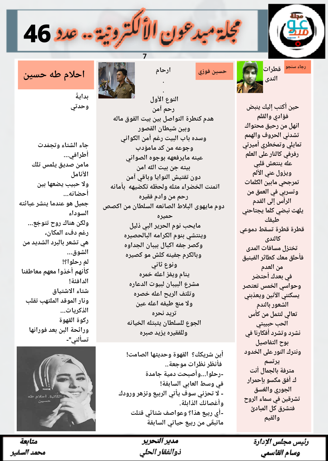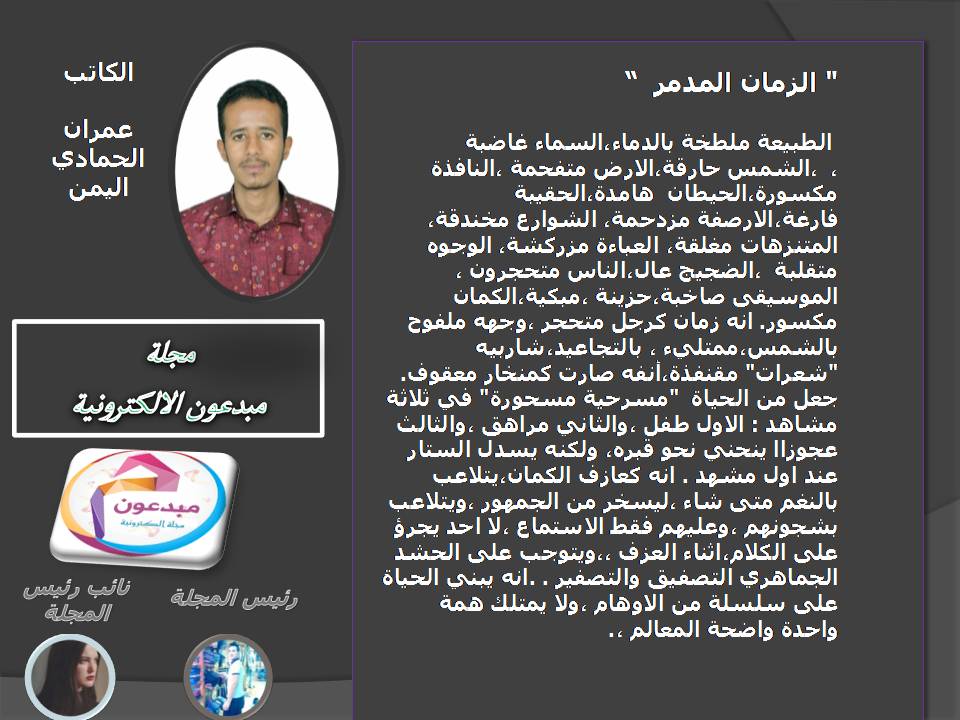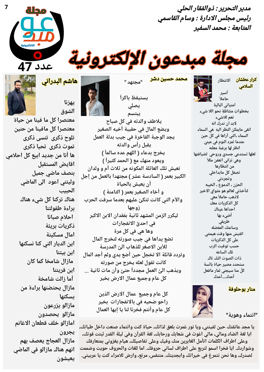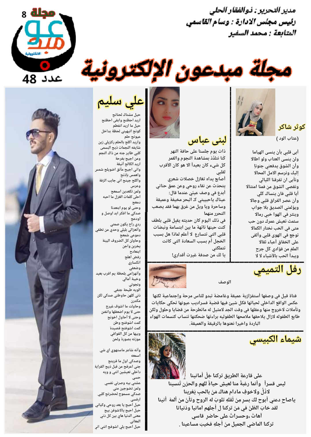 Irakurri gehiagoقصة حياة مبدع انا وانتم مع المبدع الشاعر علي الحجيمي ولد الشاعر علي عبد الكاظم حسن الحجيمي في محافظة النجف الاشرف في عام 1990 وترعرع بها واختير له اسمه الفني نسبا الى عشيرتة بني حجيم العريقة وفي مرحلة المتوسطة وخصوصا في متوسطة المتنبي بدأت موهبة الشاعر بالظهور وكتابة النص الشعبي العراقي _ويقول ان من مد لي يد العون الاستاذ حسين الخالدي وكانت اول قصيدة كتبت له في عام 2009 وطرحت الى الوسط الادبي في عام 2011. طرحنا علية عدة تساؤلات ومنها كانت مني هي ملهمتك في كتابة النص الادبي او الشعبي وكان جوابة _ وحدة موضوع القصيدة اذا كانت حسينية ف للحسين وللسيدة زينب ع واخريات للوطن والصديق والحبيبة. وانتقلنا الى فقرة ماذا يعني لك _ منتدى خواطر عائلتي الثانية _ الشاعر احمد الصالحي اخي _ اللون الأسود الخيانه _ محافظة الكوت الجمال _ الساعة السابعة صباحاً الام _ القانون الوقت _متوسطة المتنبي البذرة الاولى للشعر _ العيون النرجسية القصائد الجريئة. وننتقل الى اجمل ما كتب الشاعر علي الحجيمي من نصوص شعبية قصيدة ها شلونك هاشلونك تذكر اسمي لو نسيته انه ذاك الرادك تصير بهويته بعدك من عيوني تعرفني شريد بعدك اتنزل دمعتك لو تحس بيه بعد جنت لونك ينخبط وي لوني اريد ولك ماردتك قصيدة لو ردت اكتب جديد ليش هجي ورحت فجأه وعذبتني شبيك ماحسيت بيه وعودتني والله لو متغير افضل جااكولن حسستني ليش بأول ضحكه من غيري عفتني اااخ لو كلبي مثل ذاكرة الأعمه مايجي انسان بصفنته حتئ مااكلك شلونك لأن لونك ماحفظته حيل مكسور واكابر عافك يكلولي اكلهم لا يحبني وانه عفته انه ذاك الجذب يضحك وبطرف عينه دمعته انه ذاك البالصور جذبه ضحكته انه ذاك العالفراشه يموت سكته انه ذاك الجان واعي هسه يمشي بلاوعي انه ذاك الغيرت كلشي بحياته حتى من يضحك نعي خلوني مامهتم واغني المايوجعنكم يوجعني تدرون شنهو الراح مني راح الجنت وي روحي اوصفة الحبيته صدفة وراح صدفة احساسي من يلجمني اعرفة معناها گلبي يريد ولفة ونص اخر بعنوان عركة ليل بعدني بحيلي مامحتاج لچفوفك وانه وي الليل عركه ولمن اشعل نار تجي وتطفيها من خوفك واعرفك من تهد ماتگص رگبة طير تهد بكرابها سيوفك من اشوفنك بعيد ورحت عن العين عيني زغير تشوفك الگبل مايگدر يعوفك ابشرك هسه كام بصفة لومريت هم يكول ماشوفك عشرتك ظلمة تشبه طارف زلوفك وكل هذا واجيت محضر اعتابك بعد ماصار گلبك مثل طبت السوگ اليزورك مايدگ بابك اجيت بلا نفع بصمة على چف محروك المن جاي وشجابك جرحك بعده ماطيب لهسه انزف من اصوابك دور غيري يحلالك انه البعد مايحتاج لامثالك انه الحالة صاير زين چي ميفكر بحالك انه الگلبه ميت لازم تشيعه وثوبلي الصور والشيب والدمعه حب وانتهه وراح ومابعد رجعه هوه المنلجم ياااخ التشبعه الضل ياكل ابروحه الخاطر يشبعون اجو كلوله انت انسان لو شمعه انه الغمضت عيني وموبحال النوم حجي بعيوني خاف الوادم تسمعه تره النزلن دموعه كبال اليهابوه لو يضحك عمر ماتنشف الدمعه ان الشايل كرامه الروحي ماطخ راس من طخيته الك ضنيتك ترفعه اطمن بسمي خاطر بسمك يصيحون واكول الحب حرب ينهاب بالفزعه اذا ينطم وتد معناها خيمه تصير وانه جاي ابني بيت احلامنا بوجعه .. وآخر يقول به الشجرة المثمرة مابي فايدة يغثك المااحس بيك مثل المافهم موضوع ومركز لأن عشت الوفه يم وادم يخونون البردة اباب بيت العاهر تنشز نبرت صوتي تنشد علك للخرسان السلة التمر صوتي تكوم متبزز طبع بيه الوفة گعدة عگل عالروس موت وبي تذاكر گبل اخوي احجز وعندي احساس يندل اثر جدم الدود ويندل يامكان الضحكة التنرفز بس اسكت واگولن خلهم يصدكون السيف على الجبان وفشل من يبرز شلون ابرز سيوفي وجانوا يخافون من طبكة جفوف الحرمة من تخبز وانه الجان يكتب والدموع اتجز انه العمرة شباب وداخله معجز انه اليتمنى ساعه ينامها وميفز وان ابن الكرم حاتم جانت تعزز انه الشجرة المثمرة وماكو ريح يهز انه ذاك اليحب حتى اليجي كتال الرافع راسه والوادم بنحره تحز جمال بگلبي فدوة يروحلة الطاووس الكناري گبال صوت