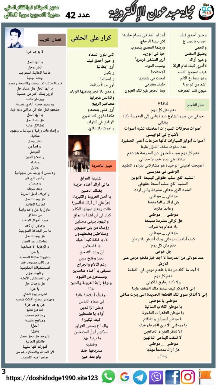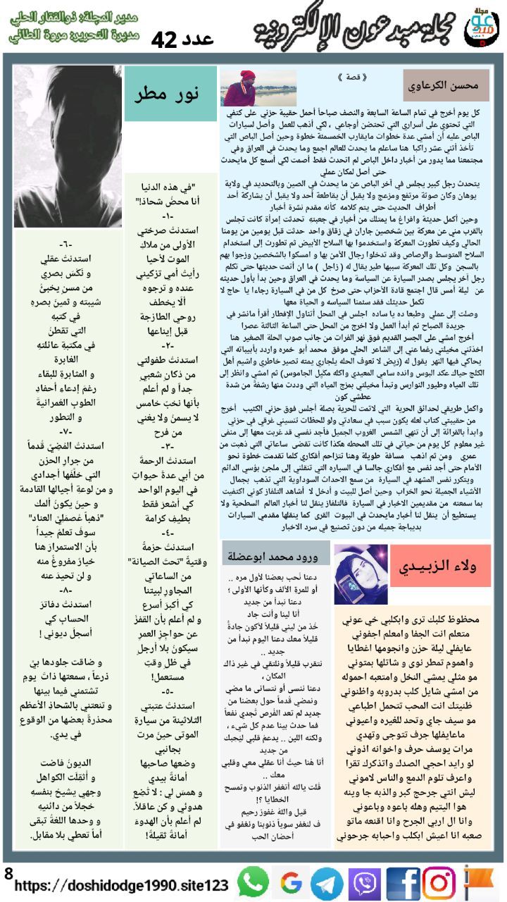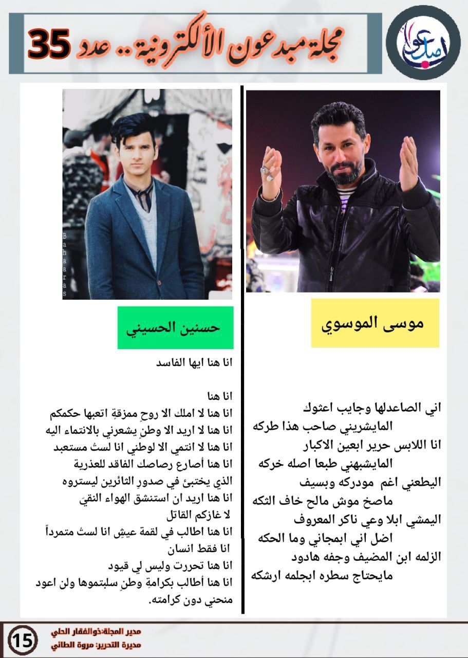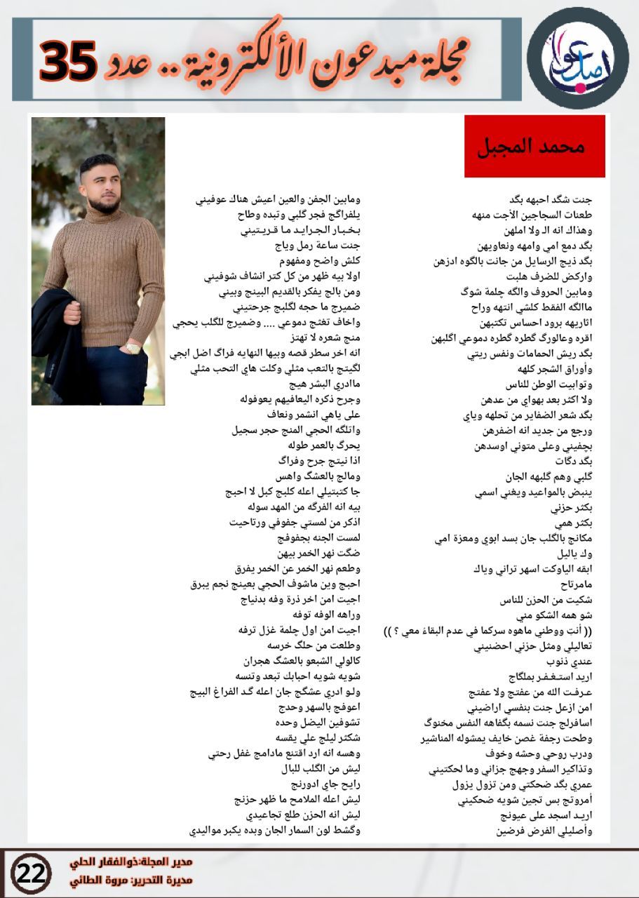 الشاعر علي ابو نؤاس من مواليد 1995 يسكن مدينة العمارة اليكم بعض من منجزة الادبي .. كالو بضهرك حجه كتلهم انه مطر خير وشتم سامع وكلوله شايل كلب كد ما قسه من الوكت يشرحون جثت إخوته وما غمض يباوع بس يالخنت باوع موت اخوتي بالسره ولا ليله اوداعك الوياه عفتني ورحت لا داهر ولا نشد حاجه اليجلي بسلف كالولي من باعك من كلتي احبك كبل عوضني الله كلت ع التجربه الاوله جا هيج صارت ولك بابك اطبكه ع ادي من تالي معقوله يالزينتك لوله بضهر التكرهه غلط هذا الحجي الينحجي وكدامنه اتكوله بس بعد كلشي انتهى ودرب السلامة الك ما اكلك اتعطل وانه من اجيتك امس طلاب ابلغك وارد ومو مالت اتفضل هالمره شايل حقد وانته ادرى بالينولي وبصفه كلهه عرف ويشاكف بوحده ولا تنتظرني التفت مو واصل لمرحلة من الكاك جثه بدرب ما اوكف اتعده بس يا شريج النفس من يمته لمن اجي اتكل لهلك شعده خاب انه الاشعده سامحتك كبل بس بعد كافي اخسر من اشوفن روحي ثاني ابيتنه اتكتر بحزن جيرانكم جنت البس انكابين وانته بدفن اهلنه وجاينه معطر تكلهم فاهي من جنت بنباهه ذيب بس حكي انشدهه وارتبك واتحير اجيت بمشلحي وشفتك حمامه صيد الكتلتك خاسرك والعفتك اتعير اخ شكد جنت من عدك اتحذر سيف مزنجر وفوك الركاب اتحوم لا من ترجع ولا ع الذبح تكدر جنت اطك اخونه بصفنه ونبريك واحنه ادوارت اعمه اندور ع الشر يوعد الكاولي الما ينسد بحلفان هواي اوجوه يطي الجام المكسر .. قصيده الشهيد صدفه ولان كمت من الوجع ناكع ممشه البلحرب مصوب وراجع كمت مبيوك شي بس ما ادري شمبيوك بوكتهه من الصدر ما واضح شطالع شفتهم وكبل لا اكلهم التربه منين جامع ماد ايده يصير بجامع ابو مكسور ضهره ودمعتنه توازيه وامي وابلايه شيله وادم تباوع واخواتي الما يعرفن باب بيتي منين يسمع صوتهن ضل جارنه السابع وحرمه بساعه وحده وشيب الناضر اوجاع اطلوك ما يتحمل الباجر وكتلهه اليخلف ما يموت اتكول جنت اتمنى يوم العرست عاجر الكاتلني الطيور الضلن احديثات حمامه بيتنه شوداهه للساتر بدمع ما مقتنع وابال ما قانع كمت ورحت اجيب المنه ما شابع وصلت ودوريت ادواره الضايع وبجيت من المطار لحد رمي الشارع وكلتله شخيرك وما رد وكتله اردود ما تعرف تسولف عين اليوادع بساعتهه صعب تعرف بحالي شلون ميت؟ واليسولف كاعد ينازع! يابو ملكه الفرهه اليعطل الجتال يالتارس هلك ومن ايدهم ضايع .. الليله مو مثل امس منتظر حكه خشم واحرك تصاويرك شكد حسستني بنقص جا هيج ما تلتفت لو ماشي من مكبره هم خوفك يديرك من كتلك اتغيرت ما كتلي احب غيرك سولفلي هذا منو الحباك وتحبه يقبل اتوصله السمه وتحط بجفه صخر ومن السمه اذبه انه بأهم مرحله وعفت الشعر من كلت ع الشعر ما احبه عيبك عفتلك بشر! ينقص افلوس الدوه خاطر يجي يشوفك وانه حكيم السلف؟ شلون فاتت على؟ لو قربيت السهم من عينك يعوفك شعدك جايني وشمخلي بوهامك حبل طاسه الحب اطول من ايامك ولك مو وصلتني لمرحله اتمنيت أنه اليدفع الكرسي بلحضه اعدامك تذكر من كلتلي من الوكت مضنوك كلت يجرالك اتنخيت بي دامك ومن خميت بيتي وماكو شي ينباع جبت كمكم هلي وحطيته كدامك اعيوبك لو بغار اتحطهن امبينات كاتل ما تضمك لفه الثامك يالمطلوبلي من جدمك لهامك جنت لبيتنه ما افوت جدامك بعد كسرت اعيونك فطن جاي اتصير الوادم لو نهر تعرف بمضامك الوياهم رحت متحزم ع الصيد رود بايكنك جعبه اسهامك .. شروه ليل احذتك والمطر نازل البخيل بيومهه ما يكدر يعامل فطن بس ما ادري شغراني واتوازيت سلعه بدرب يمهه يدك رجل جاهل حجل من جنت احط للزاجل من يروح ردت اختبرك من الماسخه اشايل واكعد وارجع من انطارتك مغلوب لا كضيت حجلي ولا من الزاجل ولك كد ما جنت وياك متساهل من كالو يذمك وين ما يرتاح ماين كلت ما كتلهم شكايل انه حجي الشقه وما يعبر ع الريج موش انه اليعبر احجايه العايل كلتلي الخوف يسبك خطوه الصطاي كلتلك يجمع المكتول والكاتل كلت يمك نهر ليش الضمه موازيك كلتلك شوك انه ع الماي ما كايل كلتلي الضحك حدمن كلتلك اكدارك وحطب روحي وخضاري ويابسي لنارك يالتكطر النشد وانه ع راك الموت أكثر 